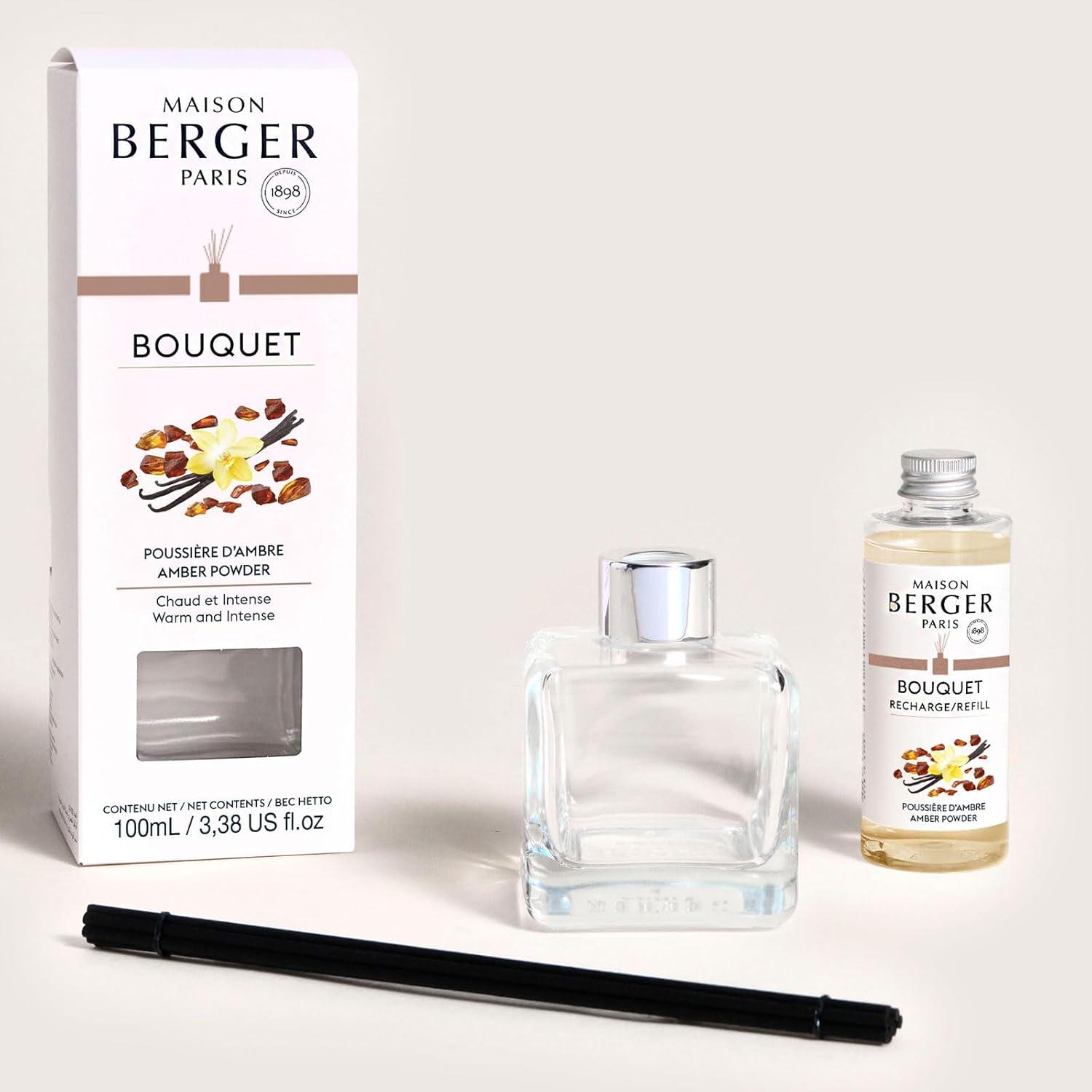 MAISON BERGER – Reed Diffuser Clear Glass Scented Bouquet – 8 Black Reed Sticks (8.3 inches) – Includes 100 Milliliters (3.4 Fluid Ounces) Fragrance Refill (Precious Jasmine)(Amber Powder)