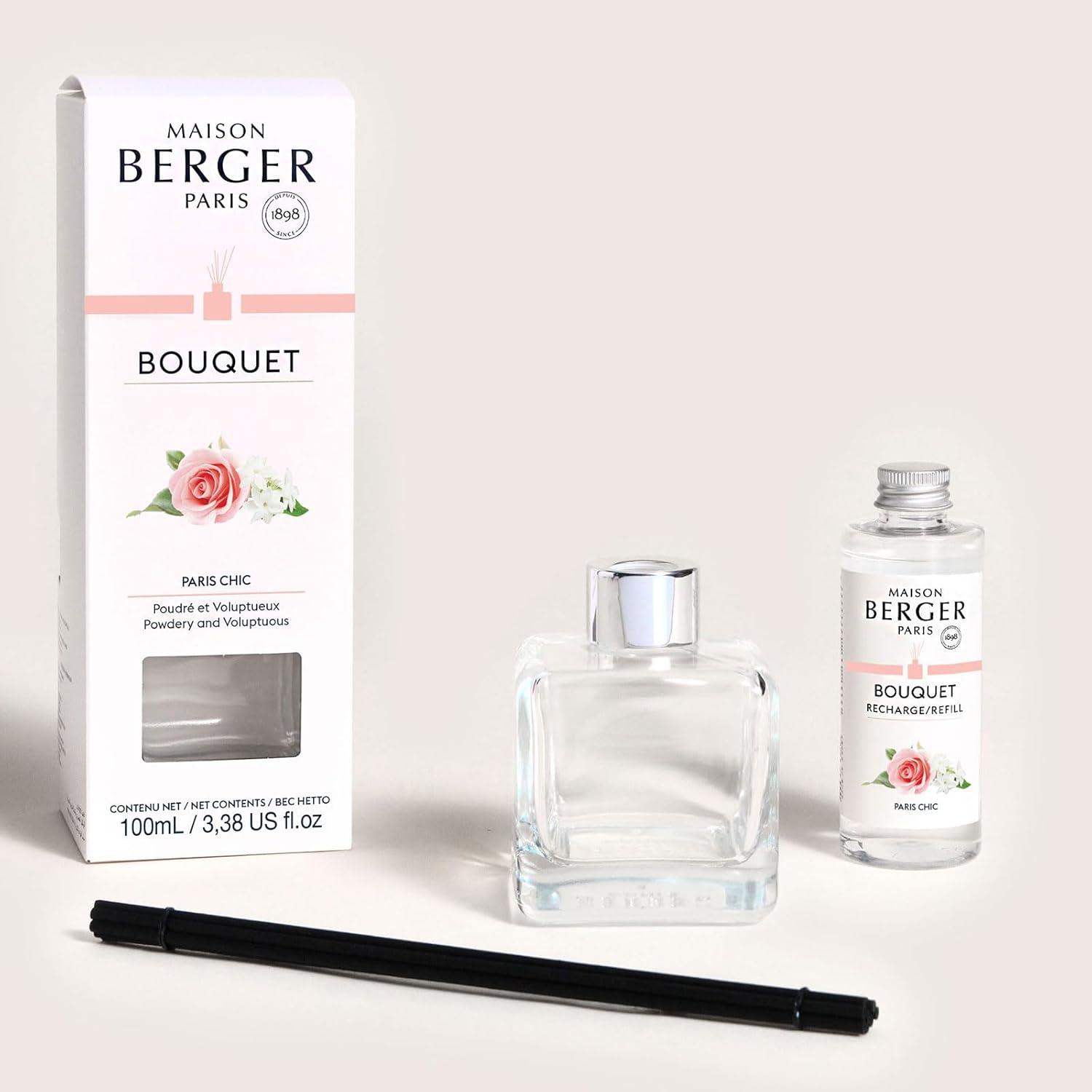 MAISON BERGER - Reed Diffuser Clear Glass Scented Bouquet - 8 Black Reed Sticks (8.3 inches) - Includes 100 Milliliters (3.4 Fluid Ounces) Fragrance Refill (Precious Jasmine)(Paris Chic)